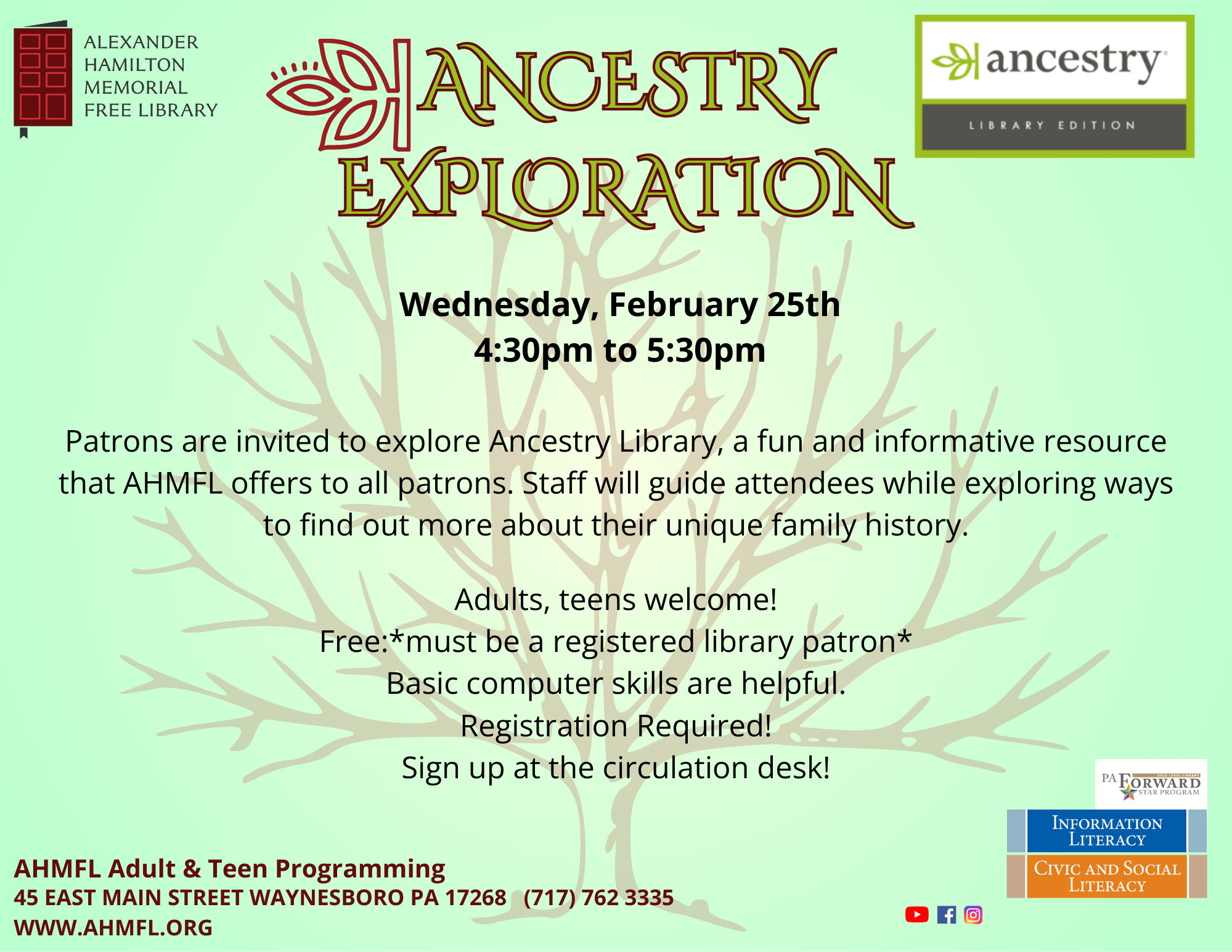 Patrons are invited to explore Ancestry Library, a fun and informative resource that AHMFL offers to all patrons. Staff will guide attendees while exploring ways to find out more about their unique family history. This program is free for adults however registration is required. Patrons MUST be a registered library patron to sign up.