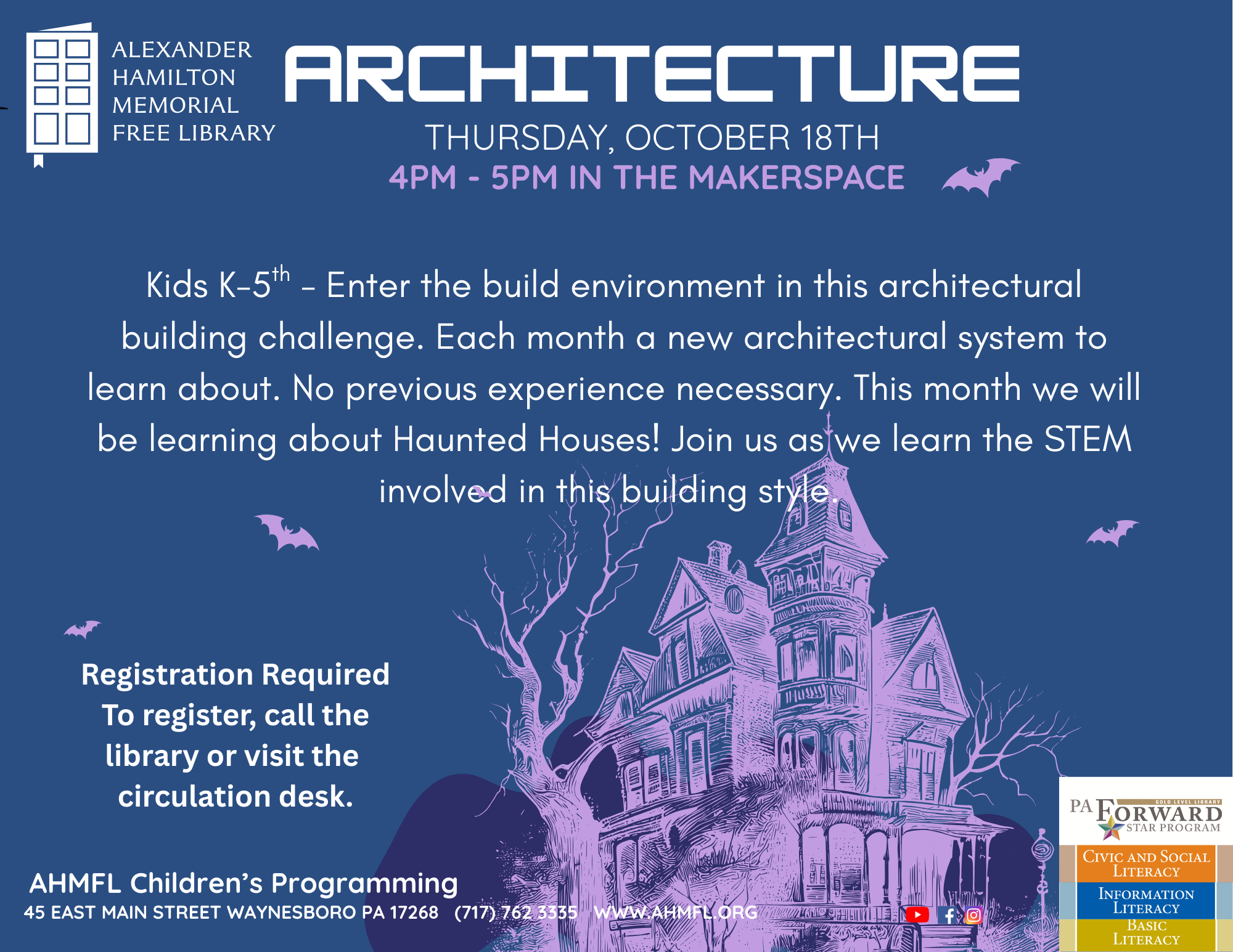 Enter the build environment in this architectural building challenge. With a new challenge each month. For October, we will be learning about Haunted Houses! This program is free to children grades K-5, however registration is required. Please call the library or visit the circulation desk to sign up.