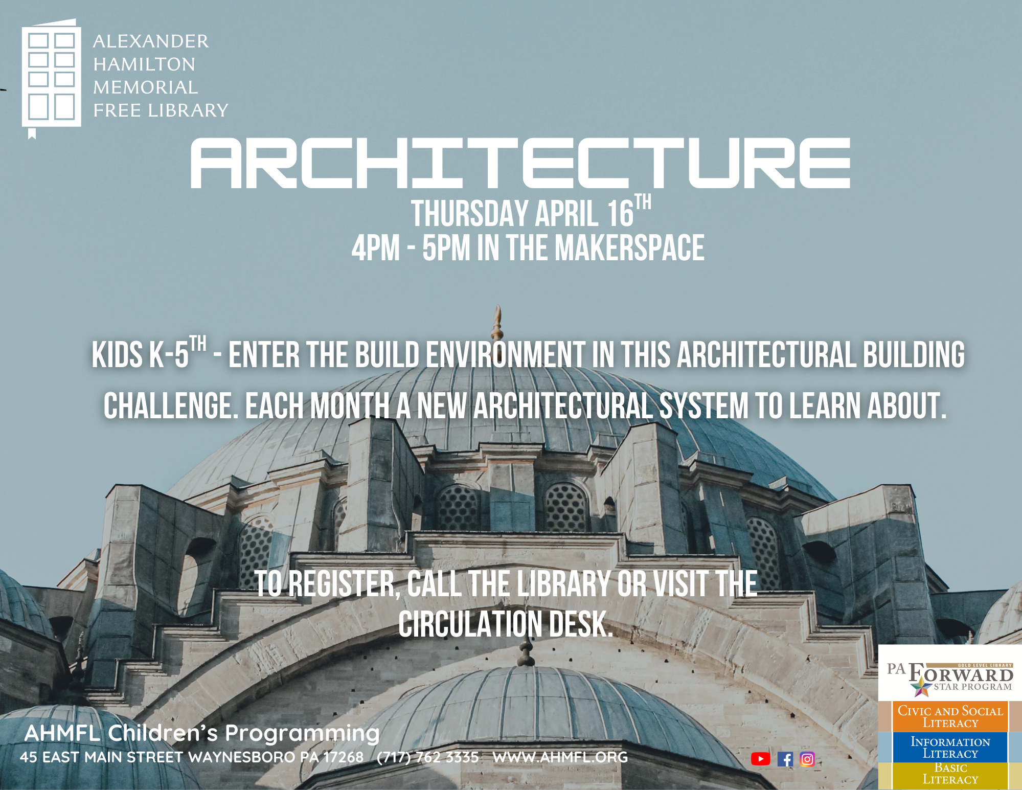 Enter the build environment in this architectural building challenge. Each month a new architectural system to learn about. This program is free for children grades K-5 however registration is required. Please call the library or visit the circulation desk to sign up.