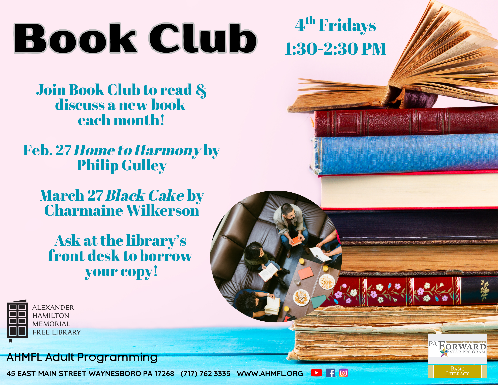 Join Book Club to read & discuss a new book every 4th Friday of the month! Ask at the front desk to borrow your copy.