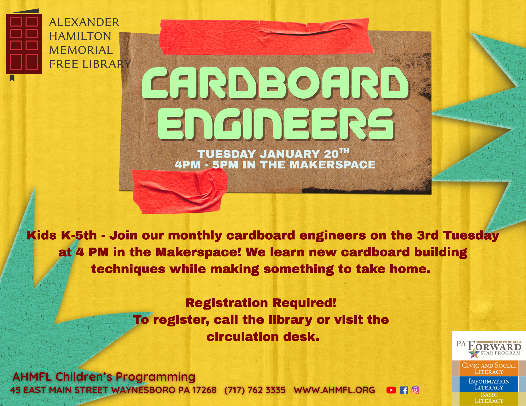 Join our monthly Cardboard Engineers on 3rd Tuesdays in the Makerspace! We learn new cardboard building techniques while making something to take home. This program is free for children grades K-5 however registration is required. Please call the library or visit the circulation desk to sign up.