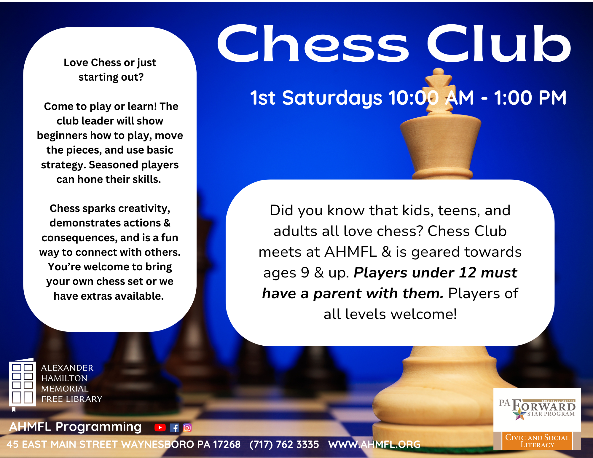 Did you know that kids, teens, & adults all love chess? This club is geared towards ages 9 & up.