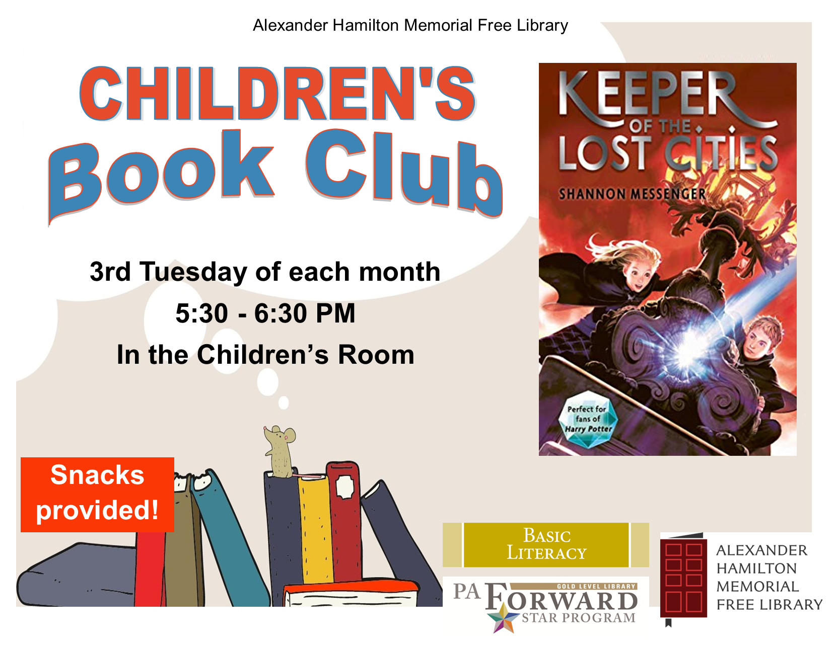 Children's Book Club Tuesday, June 20, 2023 5:30 PM 6:30 PM 17:30 18:30 Alexander Hamilton Memorial Free Library 45 East Main Street Waynesboro, PA, 17268 United States (map) Google Calendar ICS Attention kids!! Join us for our Children’s Book Club which meets on the 2nd and 4th Thursdays of each month. There is limited amount of space so registration will be required. Stop by the library and register. Come join us for the fun and snacks.