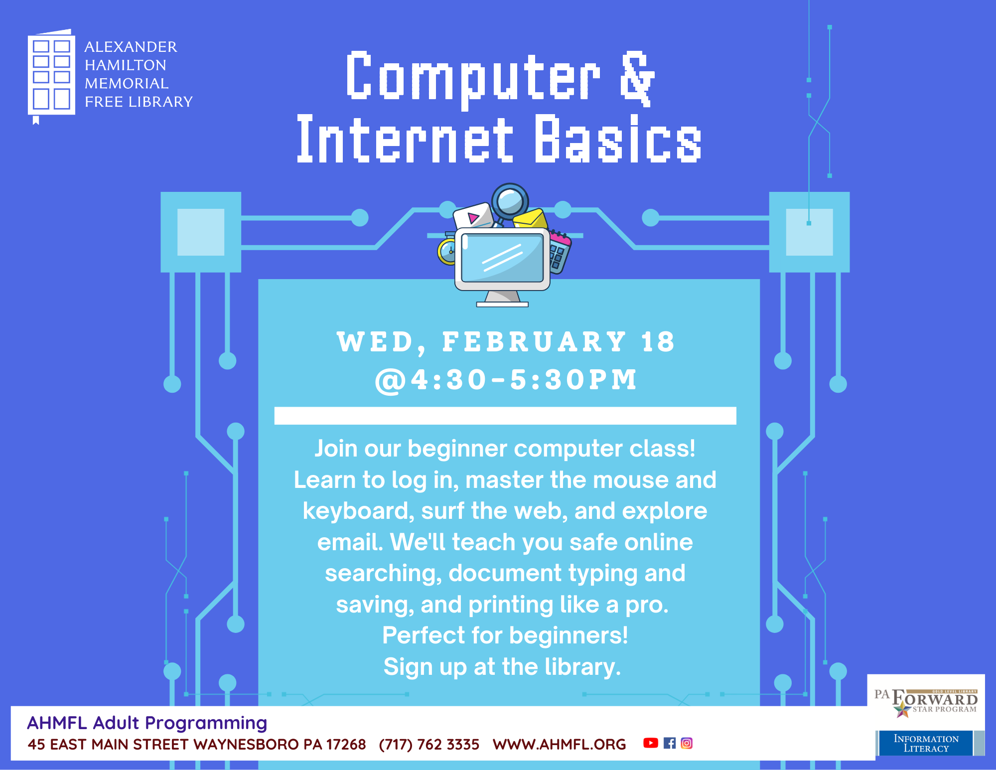 Join our beginner computer class! Learn to log in, master the mouse and keyboard, surf the web and explore email. We’ll teach you safe online searching, document typing and saving and printing like a pro. Perfect for beginners! This program is free for adults however registration is required. Please call the library or visit the circulation desk to sign up.