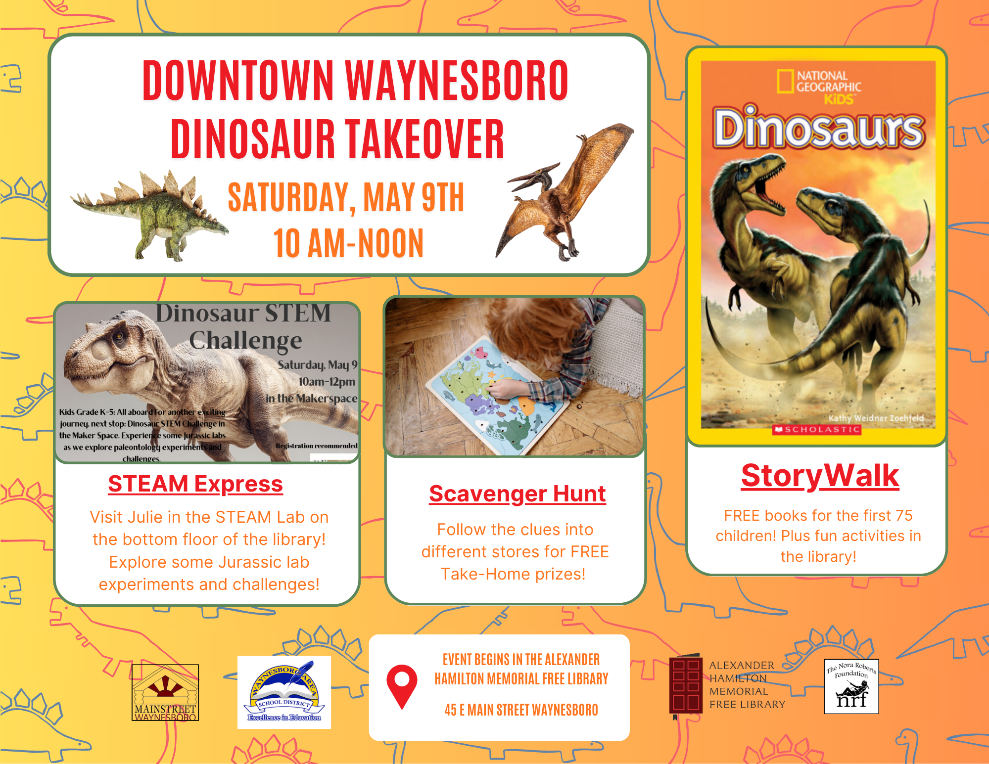 Join us at the library for Downtown Storywalk: Dinosaur Takeover! Free books will be given to the first 75 children who arrive for the scavenger hunt where you can win prizes! Visit Miss Julie in the STEAM Lab for a Dinosaur STEAM Express lab! This program is free and open for children grades K-5.