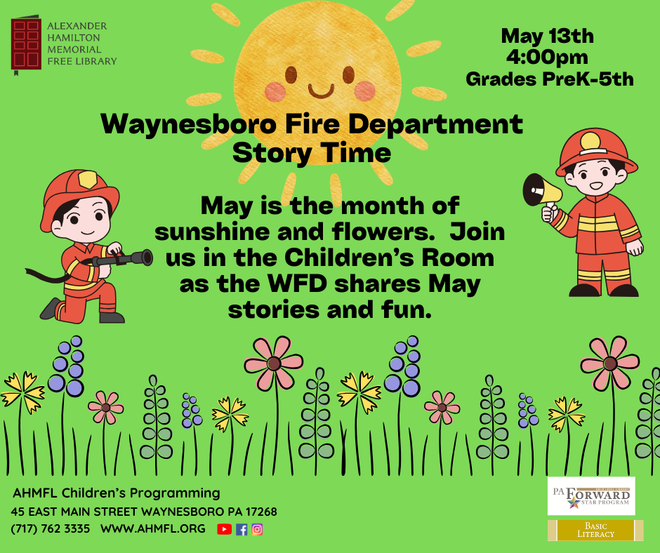 Storytime w/ Waynesboro Fire Department-Kids Wednesday, May 13, 2026 4:00 PM 5:00 PM 16:00 17:00 Alexander Hamilton Memorial Free Library 45 East Main Street Waynesboro, PA, 17268 United States (map) Google Calendar ICS May is the month of sunshine and flowers. Join us in the Children’s Room as the WFD shares May stories and fun. In the event that WFD is on a call, library staff will provide the storytelling. This program is free and open to children grades PreK-5.