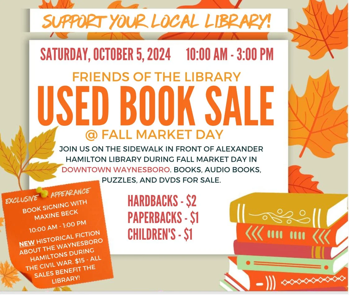 While doing your Market Day shopping, stop by the library for the Friends’ Fall Book Sale! Local author Maxine Beck will also be here signing her new book, The Waynesboro Hamiltons, from 10:00 AM to 1:00 PM.