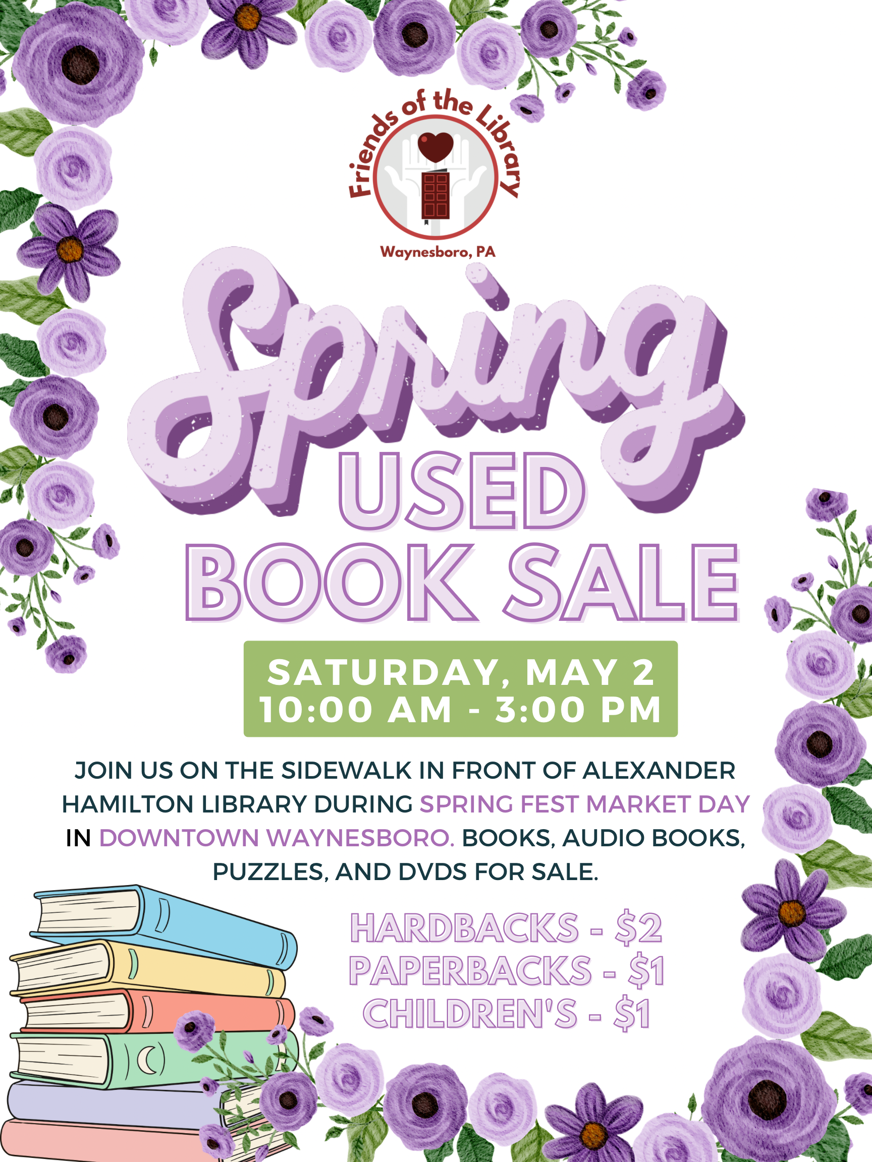 Join us on the sidewalk in front of the Alexander Hamilton Memorial Library during Spring Market Day in Downtown Waynesboro! Lots of items including books, audiobooks, puzzles and DVDs will be for sale!