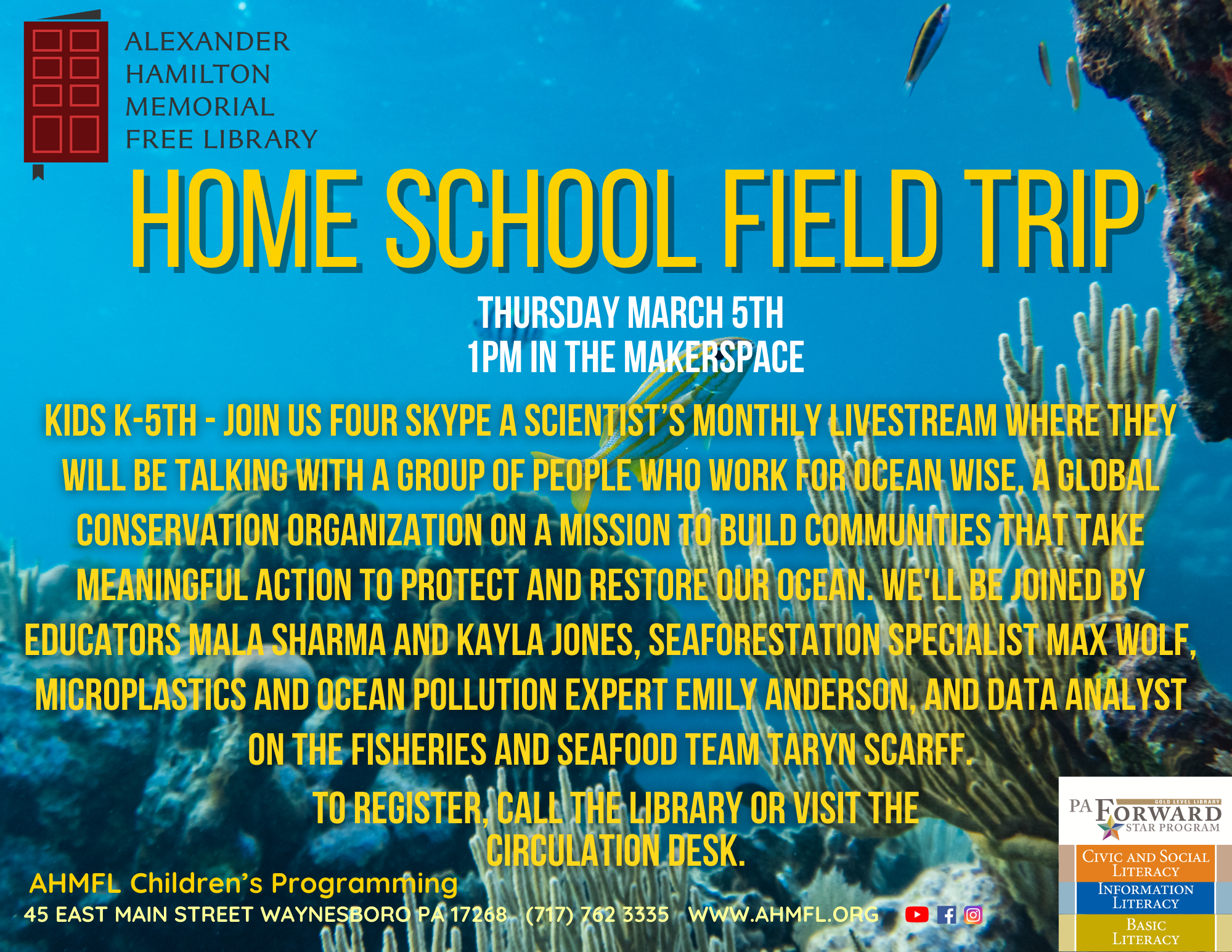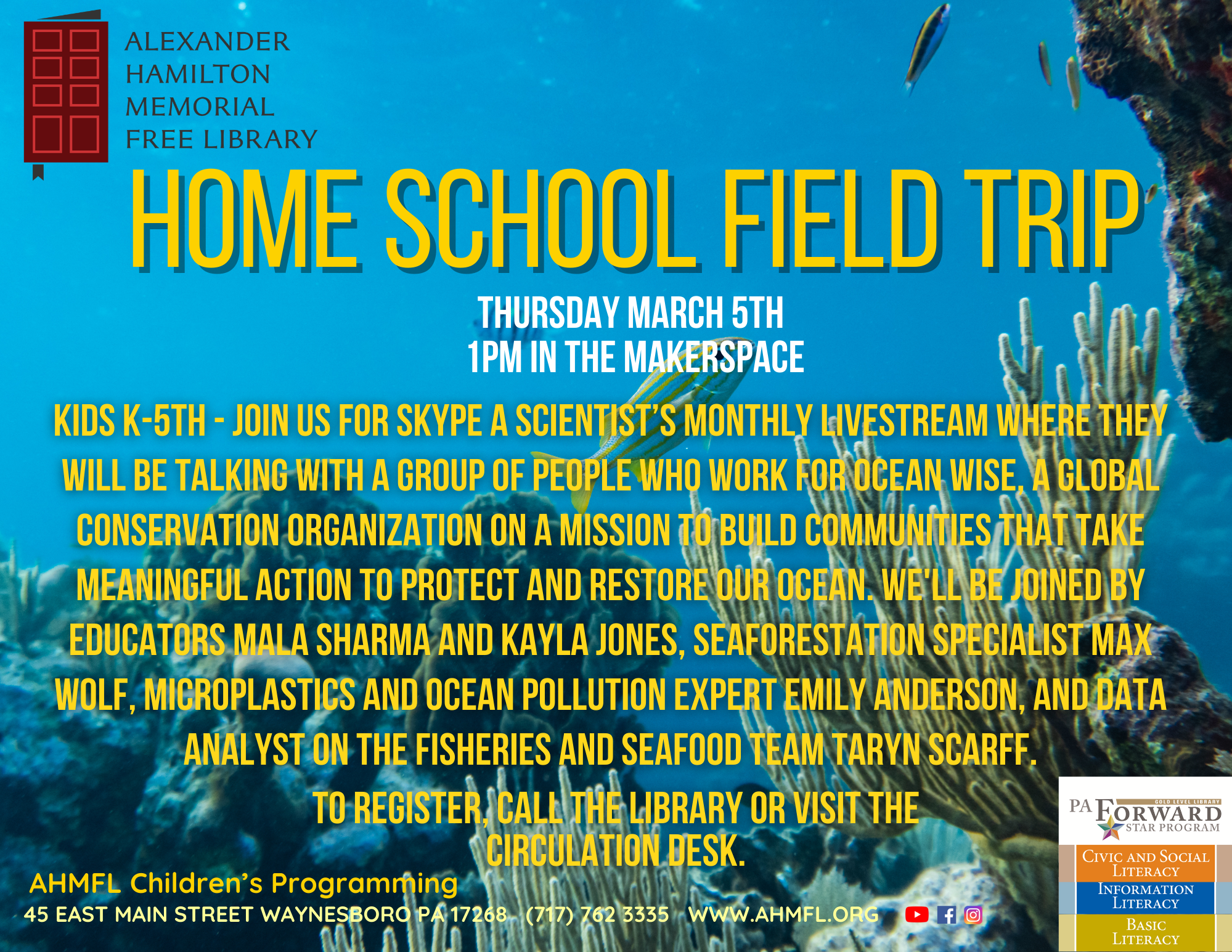 Join us for Skype a Scientist’s monthly livestream where they will be talking with a group of people who work for Ocean Wise, a global conservation organization on a mission to build communities that take meaningful action to protect and restore our ocean. We’ll be joined by educators Mala Sharma and Kayla Jones, sea forestation specialist Max Wolf, microplastics and ocean pollution expert Emily Anderson and data analyst on the Fisheries and Seafood team, Taryn Scarff. This program is free for children grades K-5 however registration is required. Please call the library or visit the circulation desk to sign up.