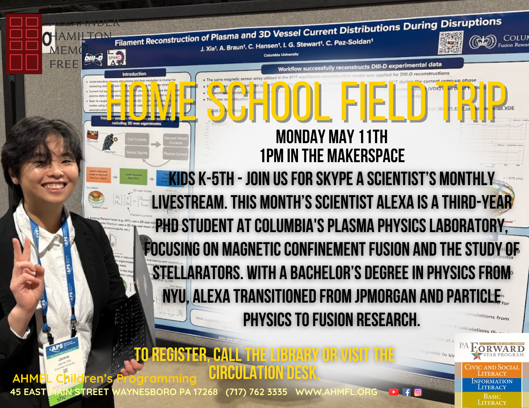 Join us for Skype a Scientist’s monthly livestream. This month’s scientist Alexa is a third year PhD student at Columbia’s plasma physics laboratory, focusing on magnetic confinement fusion and the study of stellarators. With a Bachelor’s degree in physics from NYU, Alexa transitioned from JPMorgan and particle physics to fusion research. This program is free for children grades K-5 however registration is required. Please call the library or visit the circulation desk to sign up.