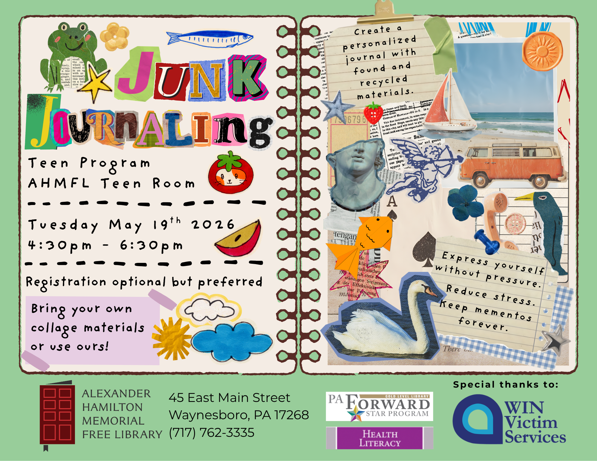 Create a unique, personalized journal using repurposed, found, or second hand materials. Preserve memories, stretch your creativity, express yourself without words! Patrons can bring their own materials or use ours.