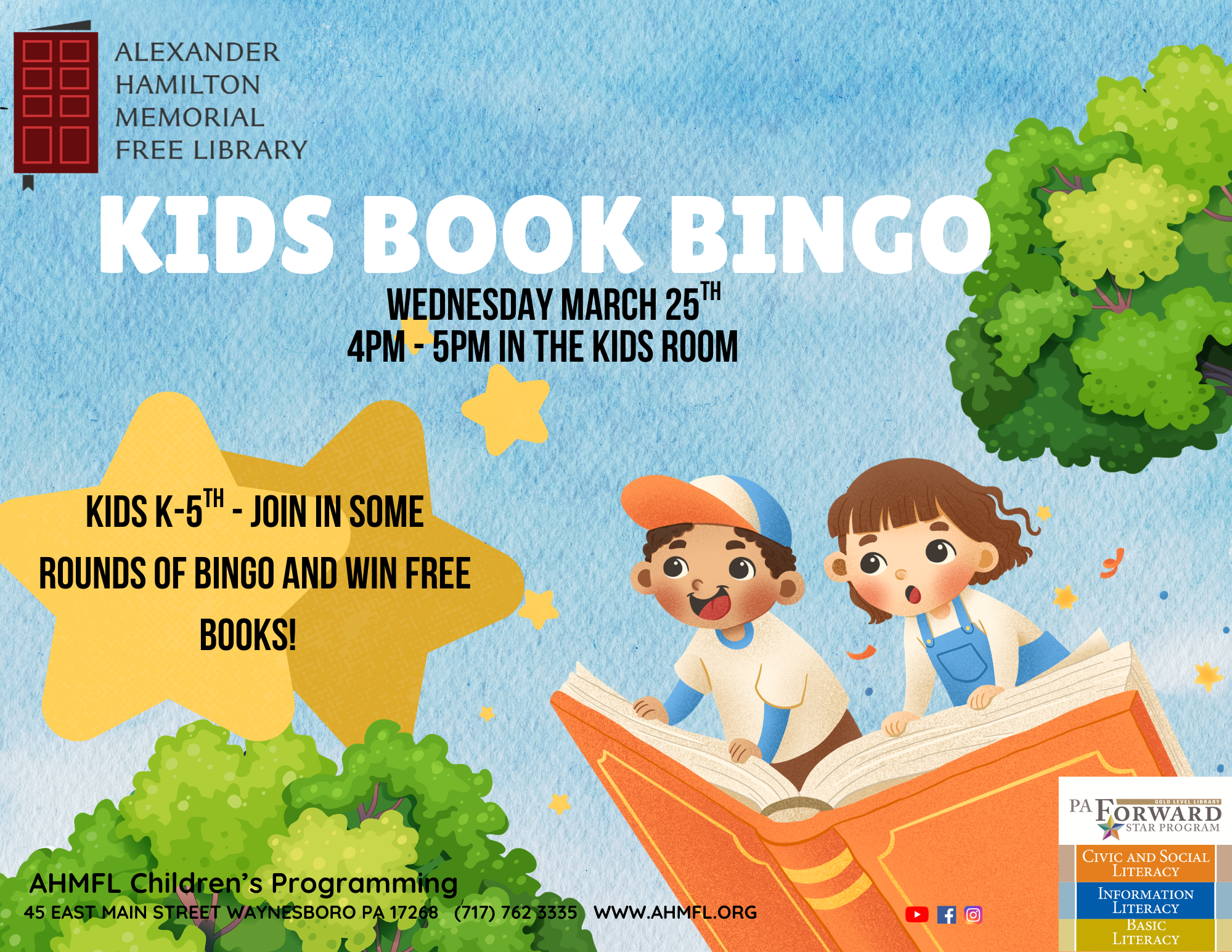 Join us in the Kids Room for a few rounds of Bingo and win free books! This program is free and open to children grades K-5.