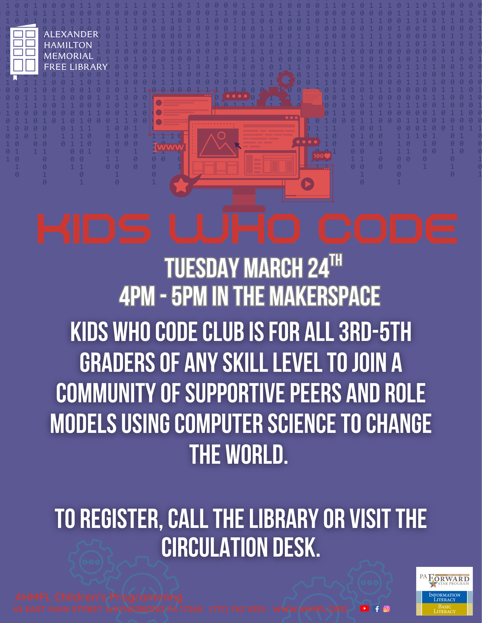 Kids Who Code-Kids (Registration Required) Tuesday, March 24, 2026 4:00 PM 5:00 PM 16:00 17:00 Alexander Hamilton Memorial Free Library 45 East Main Street Waynesboro, PA, 17268 United States (map) Google Calendar ICS Join Miss Meg in the Makerspace for this innovative program using computer science to change the world. This program is free to children grades 3-5 however registration is required. Please call the library or visit the circulation desk to sign up.