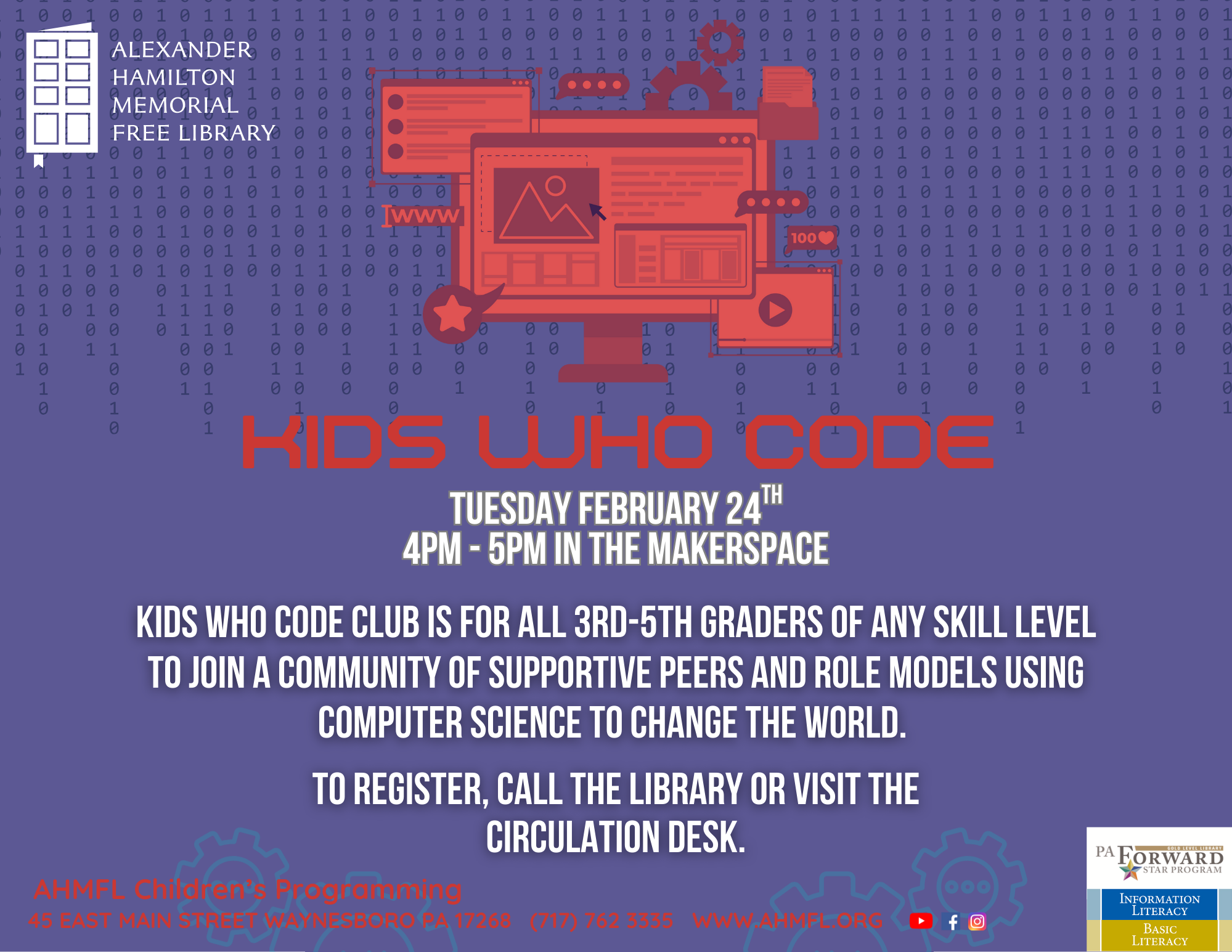 Kids Who Code-Kids (Registration Required) Tuesday, February 24, 2026 4:00 PM 5:00 PM 16:00 17:00 Alexander Hamilton Memorial Free Library 45 East Main Street Waynesboro, PA, 17268 United States (map) Google Calendar ICS Join Miss Meg in the Makerspace for this innovative program using computer science to change the world. This program is free to children grades 3-5 however registration is required. Please call the library or visit the circulation desk to sign up.