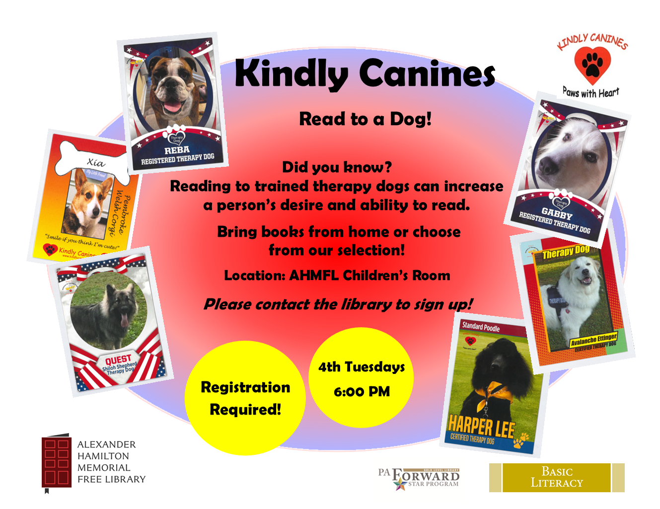 Kindly Canines are back!!! Alexander Hamilton Memorial Free Library welcomes ages 5-11 in the library’s Children’s Room to read to a variety of therapy dogs. Children may select different books from the library and/or bring their own favorite book from home to read. Kindly Canines is a regular library program held during the school year on Tuesdays at 6:00 PM.