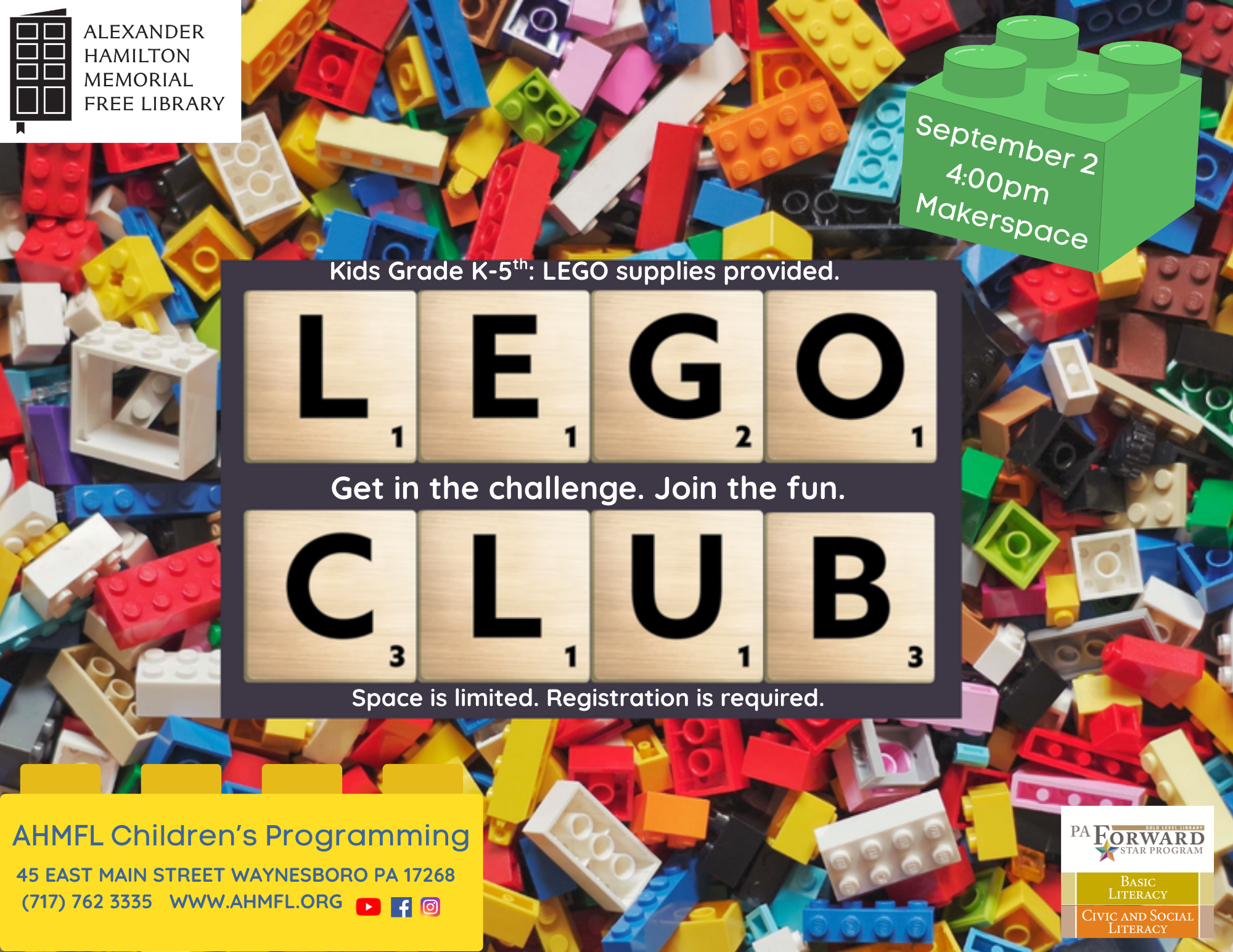 Join our monthly LEGO Club on the 1st Tuesdays of the month in the Makerspace! We have new building challenges each month. This program is free to children grades K-5, however registration is required. Please call the library or visit the circulation desk to sign up.