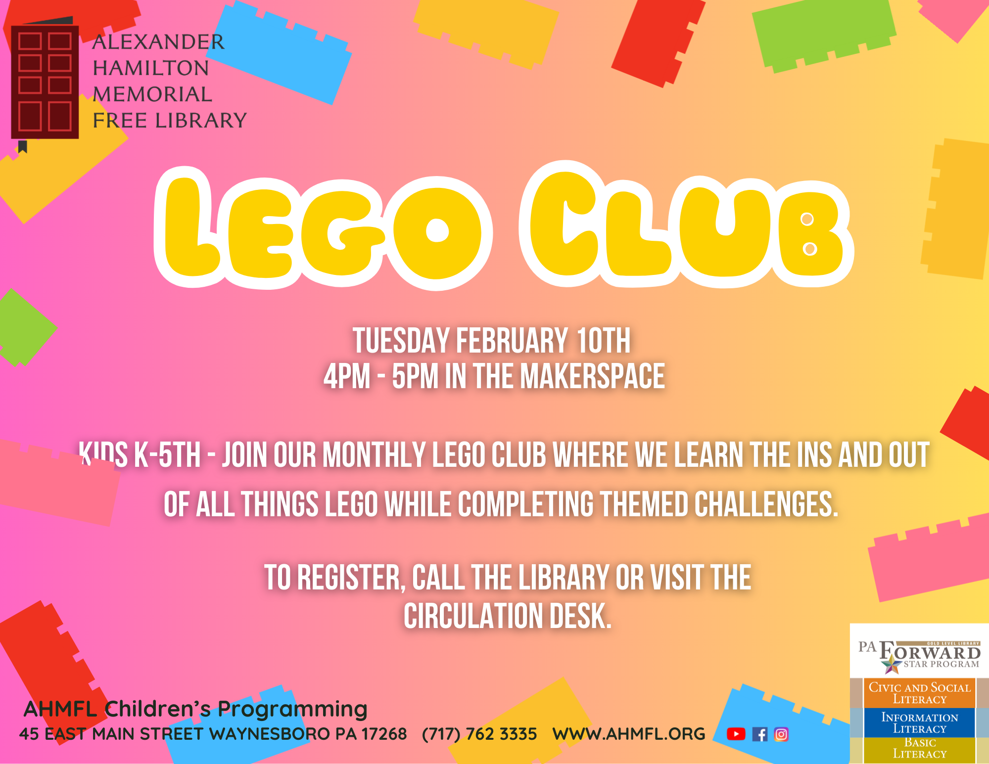Join our monthly LEGO Club where we learn the ins and outs of all things LEGO while completing themed challenges! This program is free for children grades K-5 however registration is required. Please call the library or visit the circulation desk to sign up.