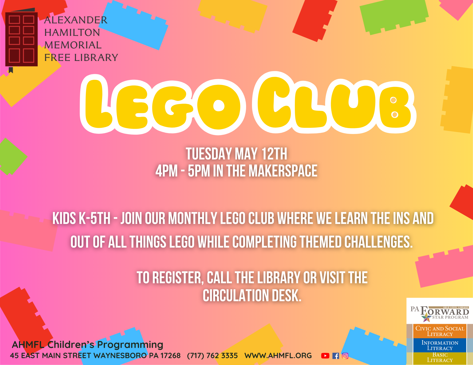 Join our monthly LEGO Club where we learn the ins and outs of all things LEGO while completing themed challenges! This program is free for children grades K-5 however registration is required. Please call the library or visit the circulation desk to sign up.