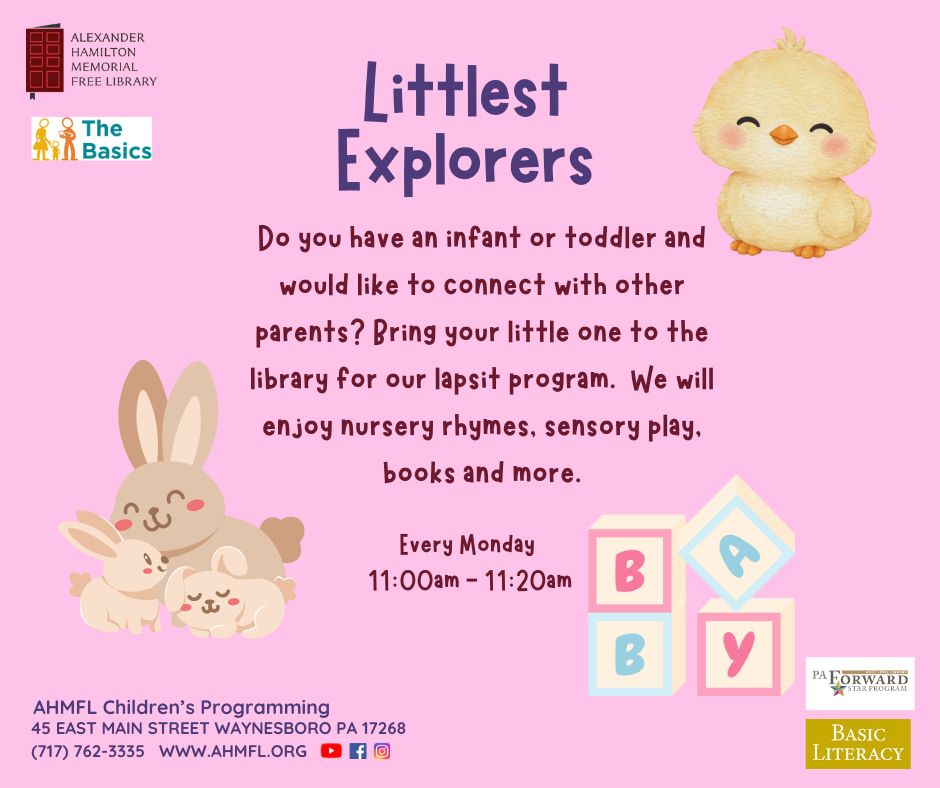 Do you have an infant or toddler and would like to connect with other parents? Bring your little one to the library for our lapsit program. We will enjoy nursery rhymes, sensory play, books and more.