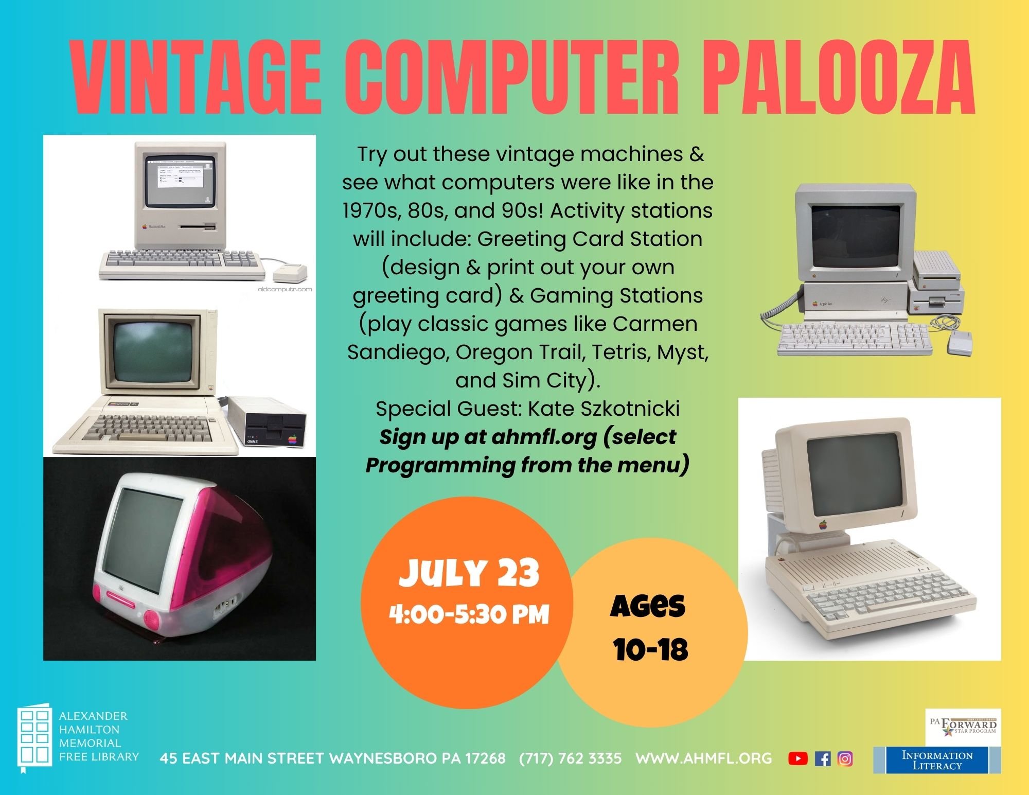 July 23—Vintage Computer Palooza—Try out these vintage machines & see what computers were like in the 1970s, 80s, and 90s! Activity stations will include: Greeting Card Station (design & print out your own greeting card) & Gaming Stations (play classic games like Carmen Sandiego, Oregon Trail, Tetris, Myst, and Sim City).