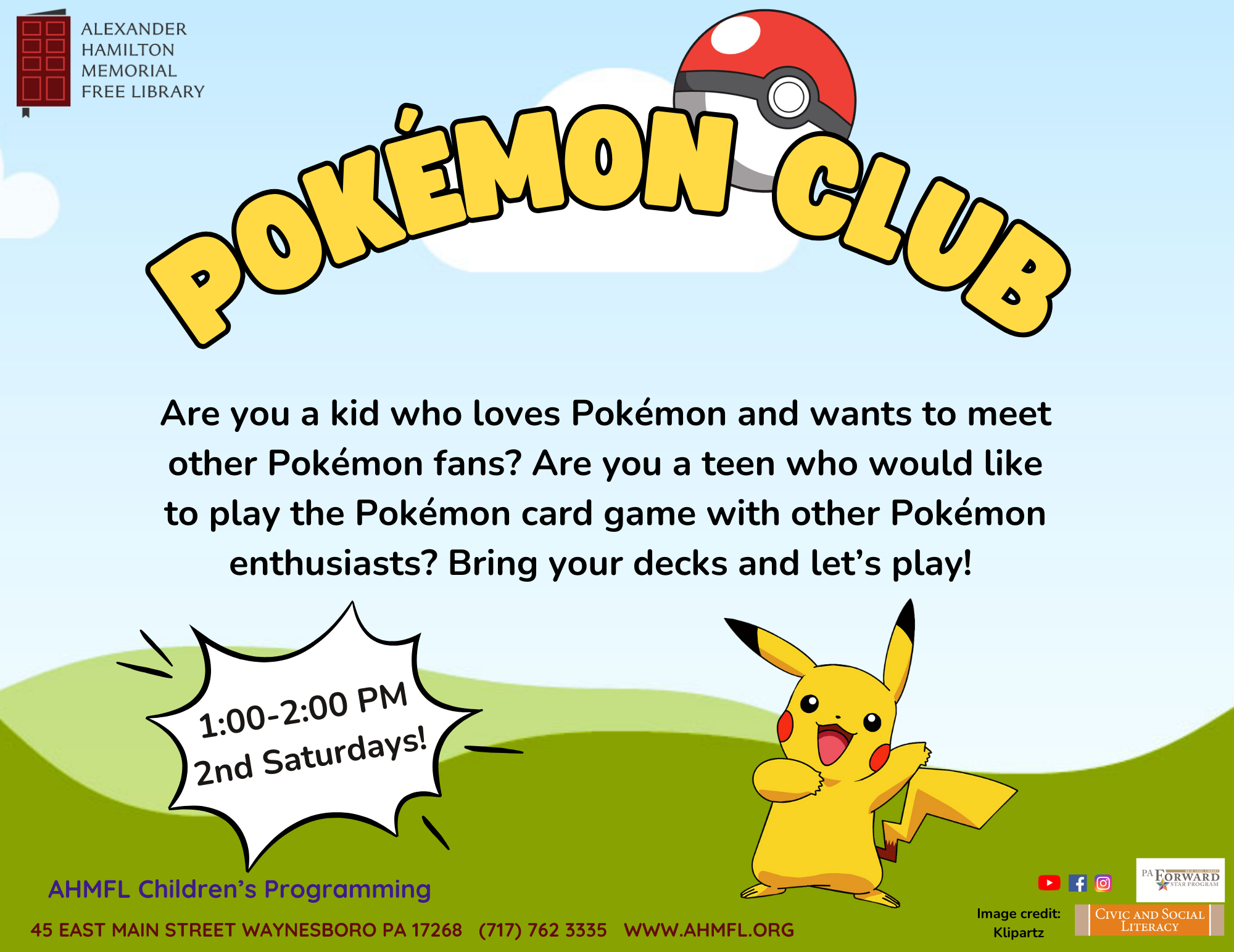 Do you love Pokemon? Do you have a deck of Pokemon cards? Join the Pokemon Club! This activity is free and open to both kids and teens.