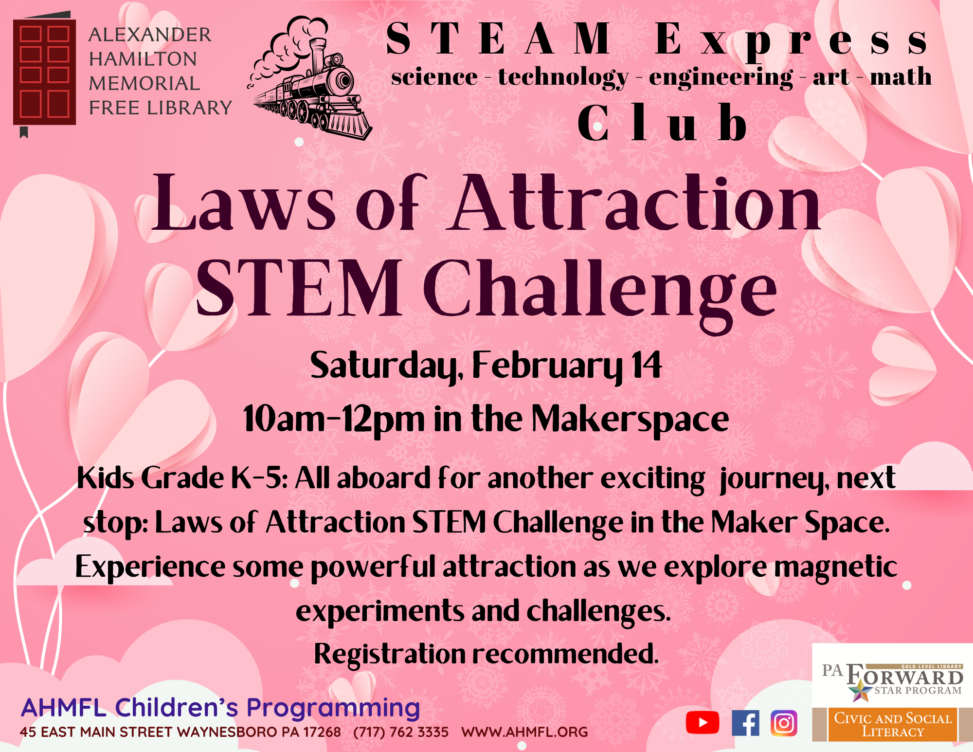 All aboard for another exciting journey on the STEAM Express! Next stop: Laws of Attraction! Experience some powerful attraction as we explore magnetic experiments and challenges. This program is free for children grades K-5. Registration is strongly recommended.