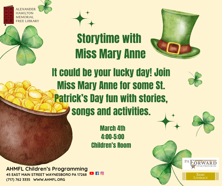 It could be your lucky day! Join Miss Mary Anne Stanley for some St. Patrick’s Day fun with stories, songs and activities. This program is free and open to children grades PreK-5.