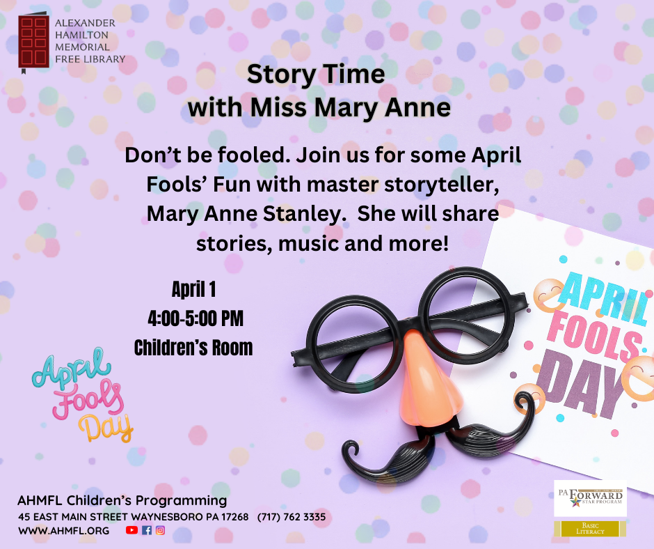Don’t be fooled. Join us for some April Fools’ Fun with master storyteller, Mary Anne Stanley. She will share stories, music and more! This program is free and open for children grades K-5.