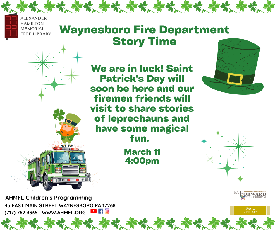 We are in luck! St. Patrick’s Day will soon be here and our firemen friends will visit to share stories of leprechauns and have some magical fun.