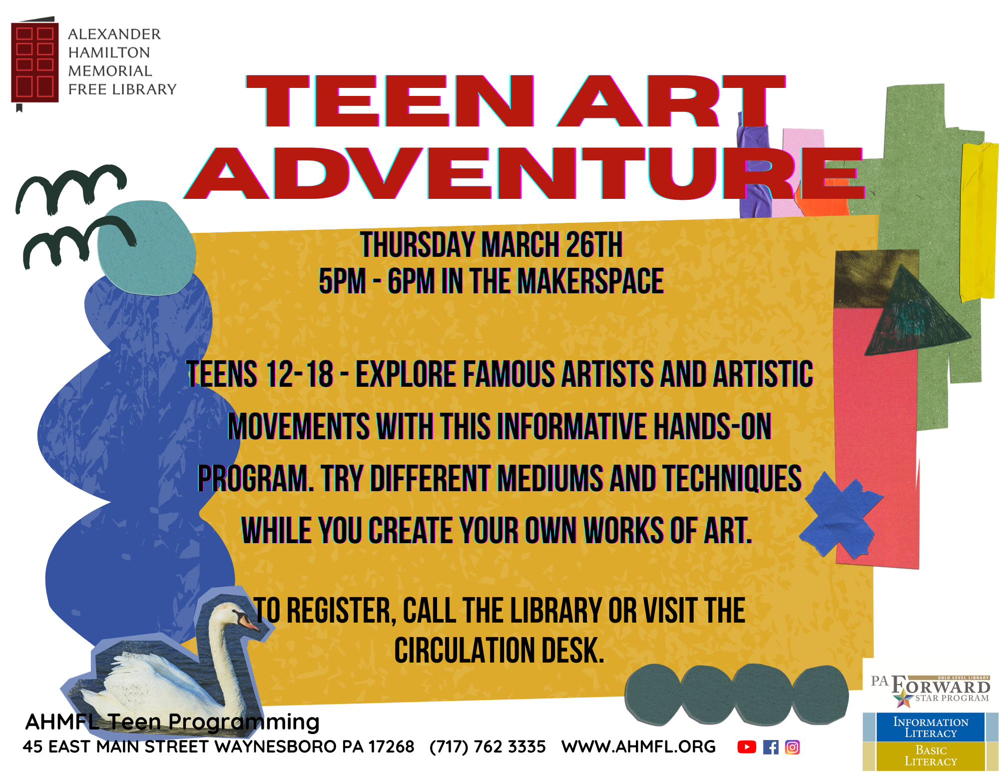 Explore famous artists and artistic movements with this informative hands-on program. Try different mediums and techniques while you create your own works of art. This program is free to teens ages 12-18 however registration is required. Please call the library or visit the circulation desk to sign up.