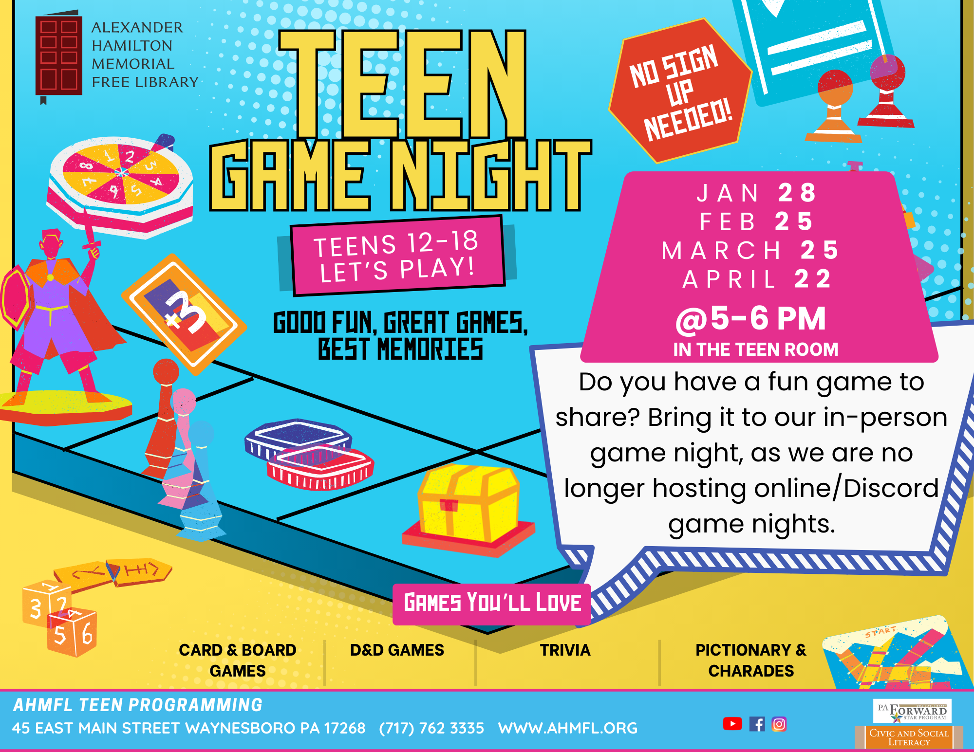 Do you have a fun game to share? Bring it to our in-person game night, as we are no longer hosting online/Discord game nights. This program is free and open to teens ages 12-18.