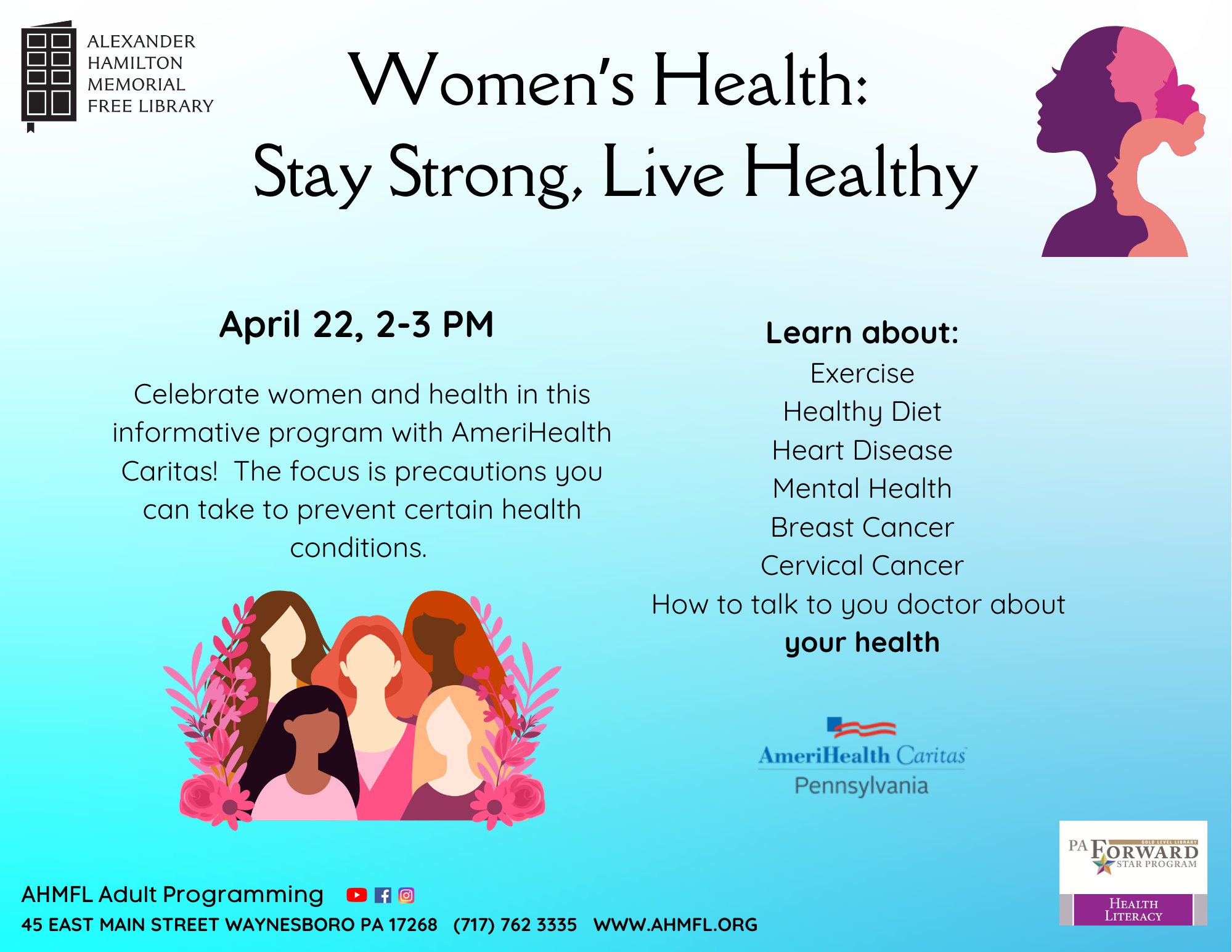 Celebrate women and health in this informative program with AmeriHealth Caritas! The focus is precautions you can take to prevent certain health conditions. Learn about, exercise, healthy diet, heart disease, mental health, breast and cervical cancers and how to talk to your doctor about your health. The program is free and open for adults; no registration required.